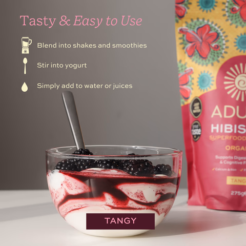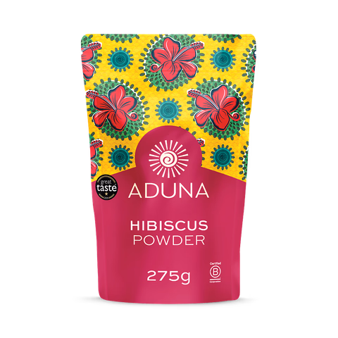 - EASY TO USE: Aduna Hibiscus has a vibrant pink colour and delicious tangy flavour. Add to smoothies, yoghurt, porridge and desserts – or simply mix with hot water for hibiscus tea