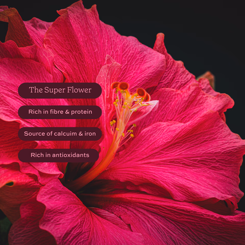 - BENEFITS: Hibiscus flower powder is a source of fibre, calcium, iron, plant protein & antioxidants, supporting a range of benefits, including gut health, immunity and skin health
