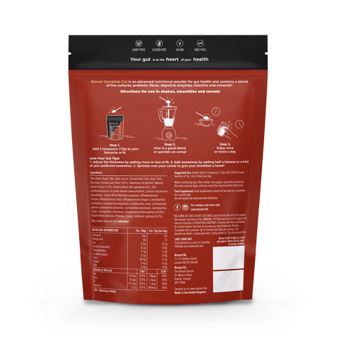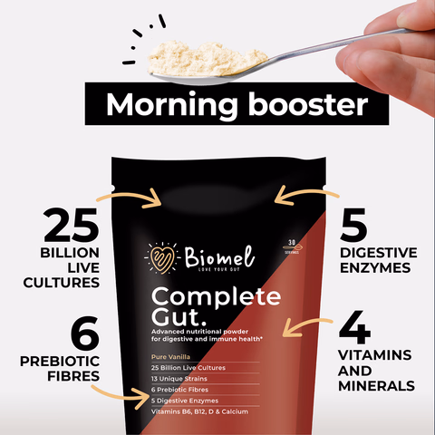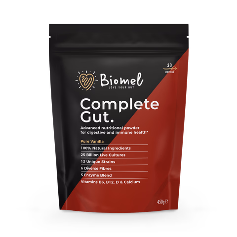 Biomel Complete Gut contains a blend of live cultures, prebiotic fibres, digestive enzymes and vitamins and minerals.