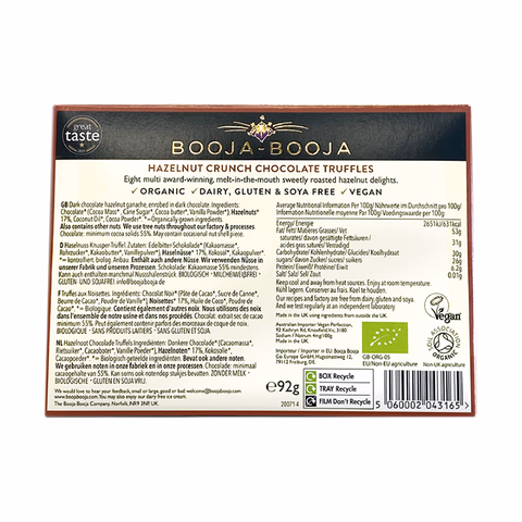 Booja Booja Hazelnut Crunch Truffles have won 19 awards – and for good reason! Made by hand, these decadently delicious organic truffles use fine cocoa beans from the Dominican Republic, and contain sweet roasted Italian hazelnuts.