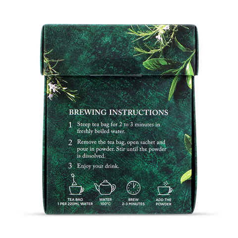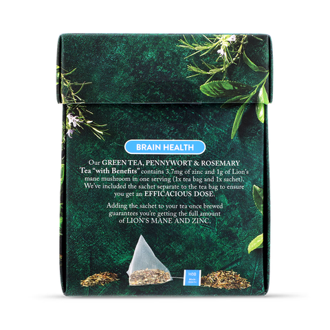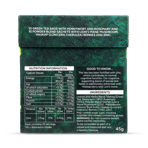 Our green, pennywort and rosemary tea contains 3.7mg of zinc and 1g of lion’s mane mushroom per one serving (1 x tea bag and 1 x sachet). Adding the “brain supporting” sachet gives you a beneficial amount of zinc — we’ve included the sachet separately to ensure you get an efficacious dose. While your tea is brewing take in a deep breath and immerse yourself in the floral aromas and earthy, nutty notes. Fortified with zinc which contributes to normal cognitive function and to the normal function of the immune system, a blend of leaves and herbs, and enhanced with Haskap berry and lion’s mane, this tea contributes to normal cognitive function and supports brain health. This B Corp Sri Lankan-based business sources the finest ingredients for our tea blends.