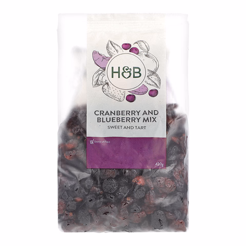 Dried Cranberries (70%) (Cranberries, Sugar), Dried Blueberries (30%) (Blueberries, Apple Juice Concentrate), Sunflower Oil.