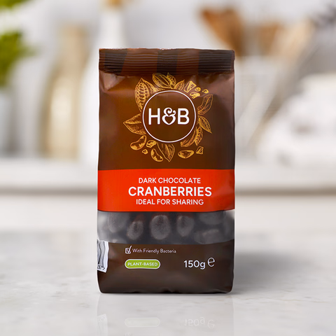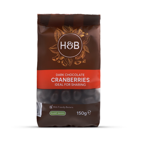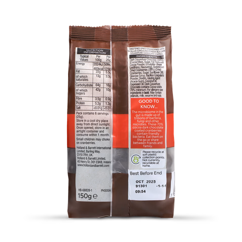 Dark Couverture Chocolate (59%) [Cocoa Mass, Sugar, Fat-Reduced Cocoa Powder, Emulsifier (Soya Lecithins), Flavouring], Sweetened Dried Cranberries (39%) (Dried Cranberries, Sugar, Sunflower Oil), Glucose Syrup, Bacillus Coagulans Powder, Dextrin, Glazing Agent (Acacia Gum), Coconut Oil, Rapeseed Oil.
