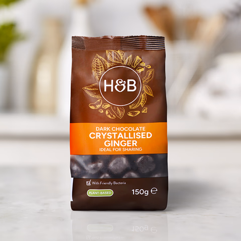 These dark chocolate-coated ginger pieces are made with friendly bacteria.The warming spiciness of crystallised ginger meets rich, smooth 70% dark chocolate for a taste explosion. Savour a couple of these ginger pieces with a hot cup of tea or mix them in a bowl with a selection of your favourite nuts and raisins.