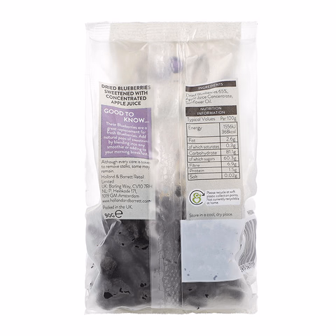 Dried Blueberries 65%, Apple Juice Concentrate, Sunflower Oil.