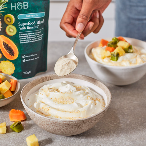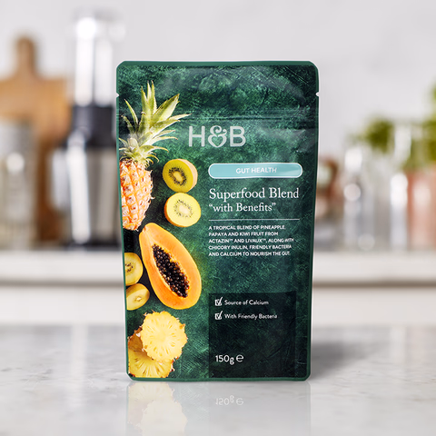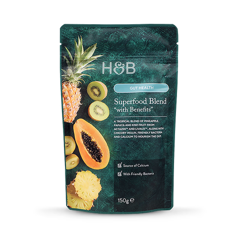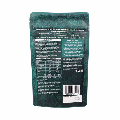 Bursting 2.5 billion friendly bacteria per serving, this superfood blend is a tropical mix of pineapple, papaya and kiwi fruit from Actazin™ and Livaux™ – derived from Green and Gold Kiwi Fruit respectively, along with chicory inulin, friendly bacteria and calcium to nourish the gut. It has been formulated with chicory, friendly bacteria, scientifically studied ingredients and a source of calcium to support healthy digestion*. *Calcium contributes to the normal function of digestive enzymes.