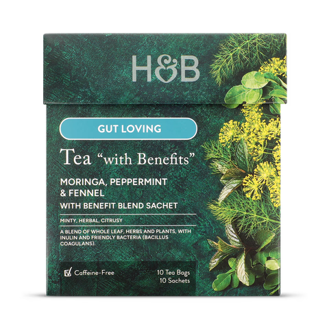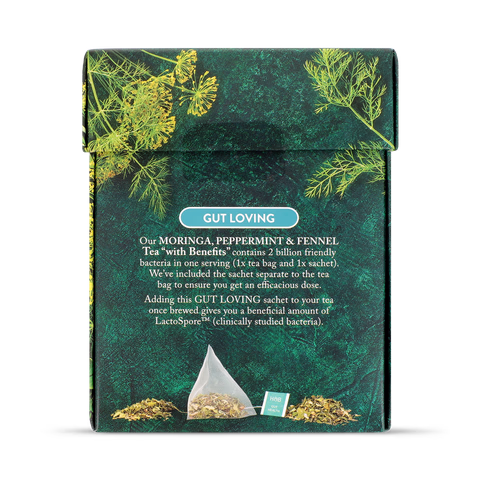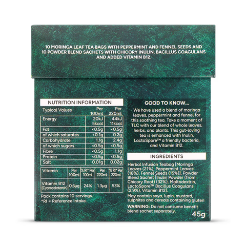 We have used a blend of moringa leaves, peppermint and fennel for this soothing tea. Take a moment of TLC with our blend of whole leaves, herbs, and plants. This gut-loving tea is enhanced with Inulin, LactoSporeâ„¢ a friendly bacteria, and Vitamin B12.