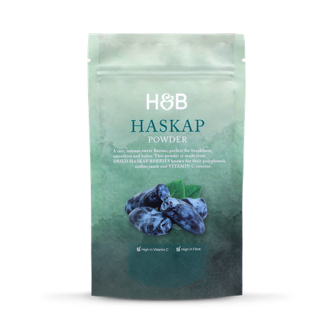 Holland & Barrett’s Haskap Powder is made from dried haskap berries, known for their polyphenols, anthocyanin and vitamin C content. They are an edible blue honeysuckle, native to cooler countries in the northern hemisphere. Haskap berries have an intense, tart yet sweet flavour – perfect for using in breakfast recipes, smoothies and bakes. Plus, this powder is high in vitamin C and in fibre.