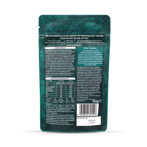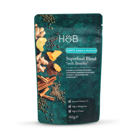This superfood blend supports joint and bone health. It contains warming spices, seeds, vitamin C, manganese and HydroCurc™ – a scientifically-studied Curcumin Extract HydroCurc™ from turmeric. It’s blended with ginger, cinnamon, turmeric powder, flaxseed, pumpkin seeds, hemp seeds and black pepper extract, with added vitamin C and manganese to create a deliciously spiced powder that can be sprinkled into your meals, adding support for your joints and bone health. Manganese contributes to the maintenance of normal bones and the normal formation of connective tissue. Vitamin C contributes to normal collagen formation for the normal function of cartilage and bones. Protein contributes to a growth in and maintenance of muscle mass, and the maintenance of normal bones.