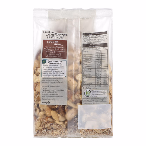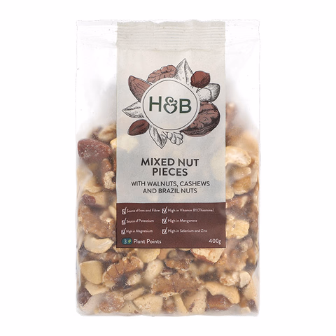 Holland & Barrett Mixed Nut Pieces contain walnuts, cashews and Brazil nuts. Our Mixed Nut Pieces are rich in Manganese, Zinc and Selenium.