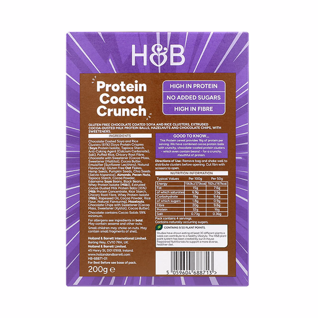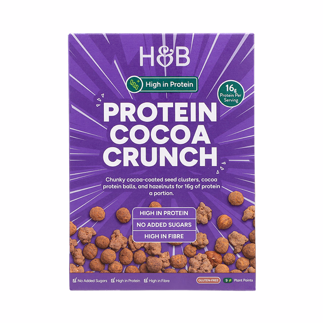 This delicious, gluten-free protein cereal provides 16g of protein per serving and combines cocoa protein balls with crunchy, chocolate-coated protein clusters, chocolate chips and nuts. High in protein with no added sugars, this cereal offers a classic, childhood favourite alternative that’ll support your daily protein intake. And the best part is you’ll get to drink up the chocolate milk that’s left after munching and crunching. Plus, studies have shown that eating at least 30 different plants a week can contribute to a healthy lifestyle. The Holland & Barrett plant point system has been created by our in-house registered nutritionists to support a more diverse, healthier diet. And this high protein cocoa crunch boasts a 9/30 plant point scoring.