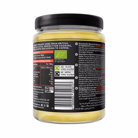 Sunshine in a jar. A creamy organic ghee from british, grass fed cattle. Perfect for cooking, frying, baking and adding to coffee.