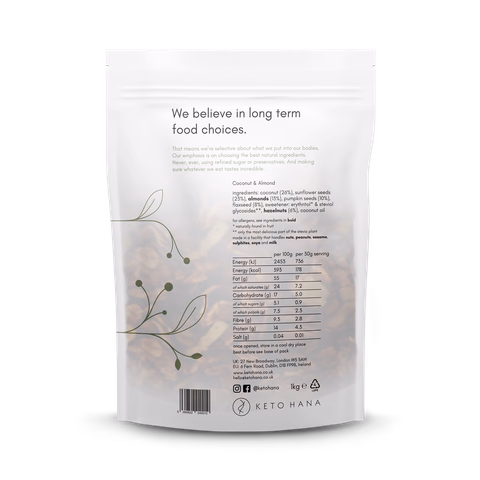 Coconut (26%), sunflower seeds (23%), almonds (13%), pumpkin seeds (10%), flaxseed (8%), sweetener: erythritol & steviol glycosides, hazelnuts (6%), coconut oil.