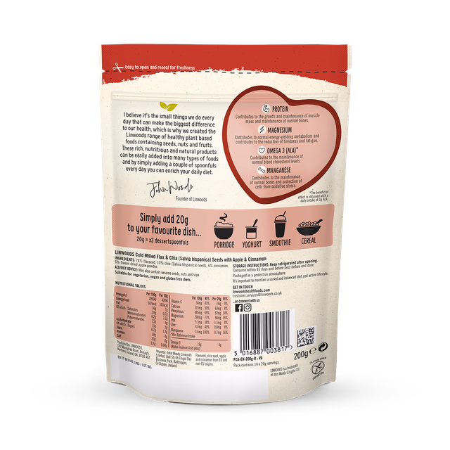 This blend brings together two tiny seeds with major health benefits and adds extra flavour with the delicous addition of apple and cinnamon! High in Omega 3 (ALA)* to help maintain normal blood cholesterol levels, this taste sensation also helps to maintain normal bones and contributes to the protection of cells from oxidative stress. *The beneficial effect is obtained with a daily intake of 2g ALA.