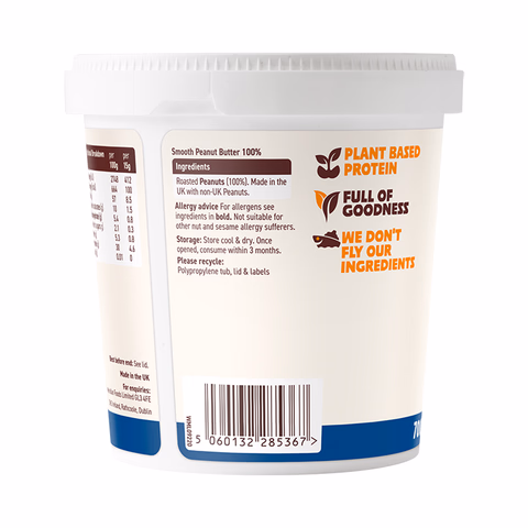 Roasted PEANUTS (100%). Made in the UK with non-UK Peanuts.