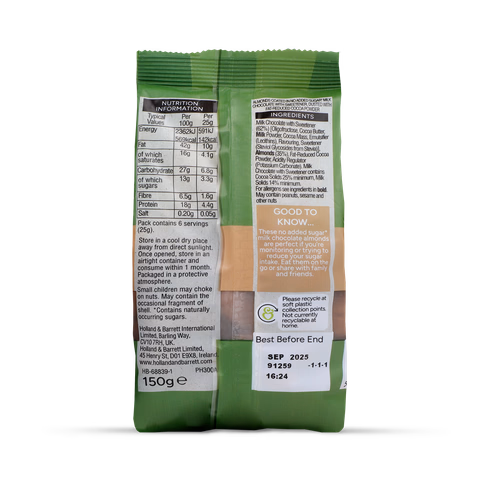 Milk Chocolate with Sweetener (62%) [Oligofructose, Cocoa Butter, Milk Powder, Cocoa Mass, Emulsifier (Lecithins), Flavouring, Sweetener (Steviol Glycosides from Stevia)], Almonds (35%),Fat-Reduced Cocoa Powder, Acidity Regulator (Potassium Carbonate).