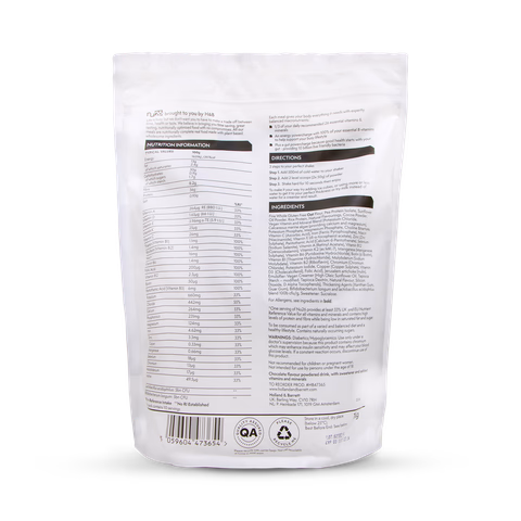 Fine Whole Gluten Free Oat Flour, Pea Protein isolate, Sunflower Oil Powder, Rice Protein, Natural Flavourings, Cocoa Powder, Vegan Vitamin and Mineral Blend (Potassium Chloride), Lithothamnion Seaweed (providing calcium and magnesium) / Calcareous marine algae (providing calcium and magnesium), Potassium Phosphate, Magnesium Phosphate, Choline BItarttate, Vitamin C (Ascorbic Acid), Iron (Ferric Pyrophoshate), Niacin (Niacinamide), Vitamin E(dl-a-tocopherol acetate), Zinc (Zinc sulphate), Pantothenic Acid (Calcium d-Pantothenate), Selenium (Sodium Selenite), Vitamin A (retinyl Acetate), Vitamin B12 (Cyanocobalamin), Vitamin K2( as MK-7), Manganese (Manganese Sulpgate), Vitamin B6 (Pyridoxine Hydrochloride), Biotin (d-Biotin), Vitamin B1 (thiamine Hydrochloride), Molybdenum (Sodium Molybdate), Bitmain B2 (Riboflavin), Chromium (Chromium Chloride), Potassium Lodide, Copper (Copper Sulphate), Vitamin D3 (Cholecalciferol), Folic Acid, Jerusalem arichoke (Inulin), Emulsifier: Vegan Creamer (High Oleic Sunflower Oil, Tapioca Starch – Modified, Tapioca Dextrin, Natural Flavour, Silicon Dioxide, D Alpha Tocopherols), Thicking agents ( Xanthan Gum, Guar Gum), Bifidobacterium longum and lactobacillus acidophilus blend 100b cfu/g, Sweetener: Sucralose.