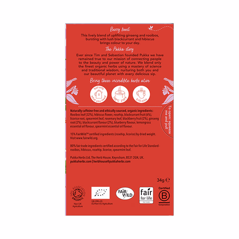 - Bursting with sweet blackcurrant, succulent blackberries, and refreshing hibiscus, the fruity flavours are complimented by the revitalising essence of rooibos, rosemary, and ginseng.