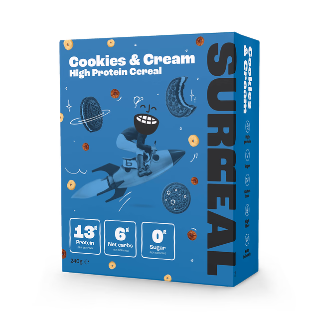 Surreal’s high protein cereal tastes just like your childhood faves – with none of the junk. High protein – 13g per bowl, 0.49g sugar per serving – and still super tasty and gluten free.