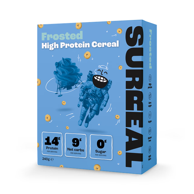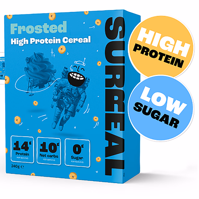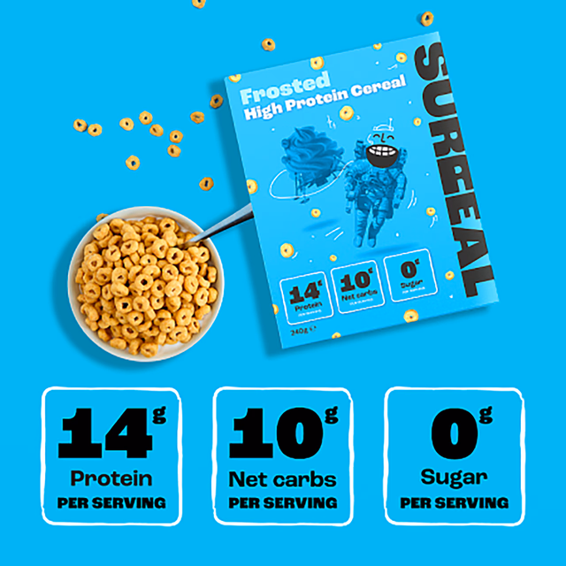 Want to satisfy your sweet tooth without a sugar overdose? Surreal’s high protein Frosted Cereal is just what you need. Each bowl has 14g protein, and 0g sugar, making it the perfect sweet treat.