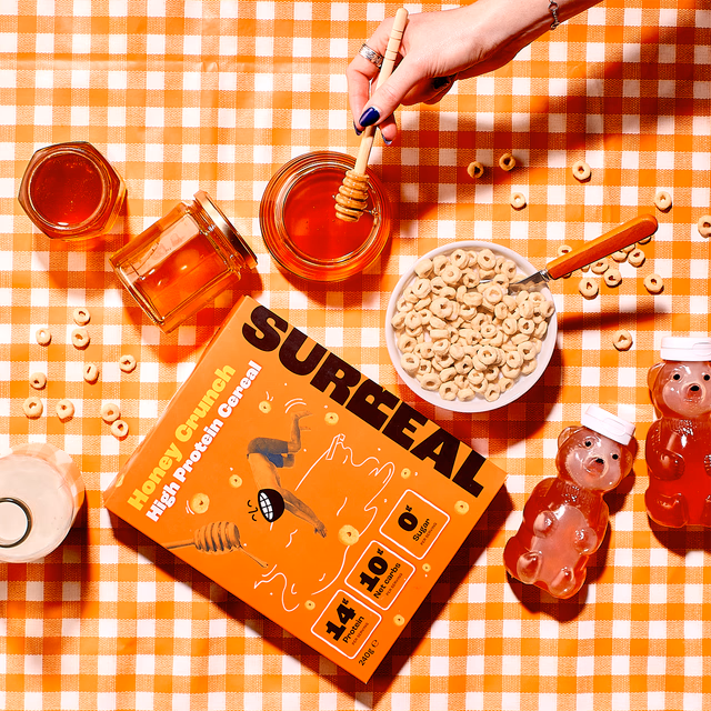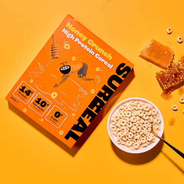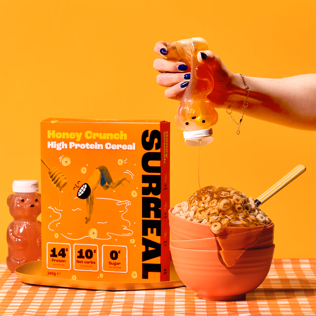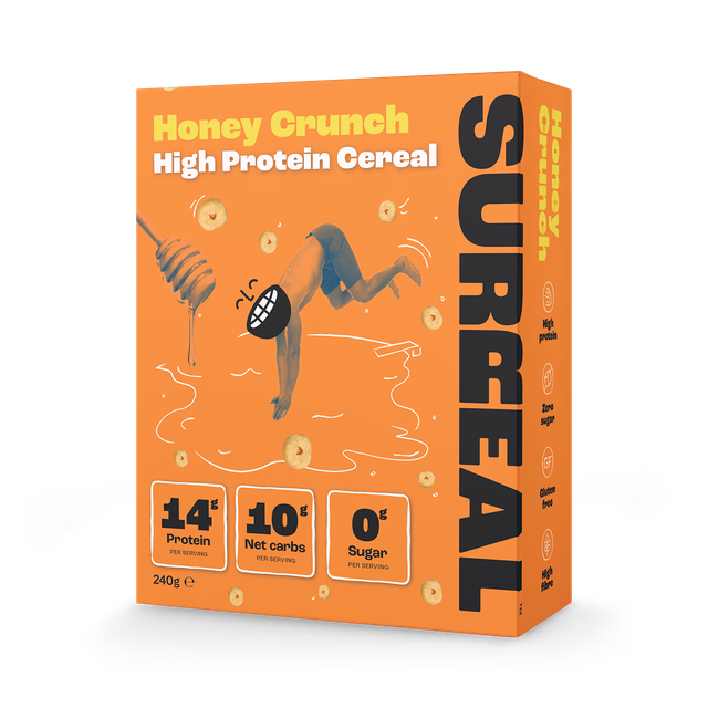 Surreal’s high protein Honey cereal has a sweet honey taste. And with 14g protein and 0g sugar, it’s packed full of good stuff.