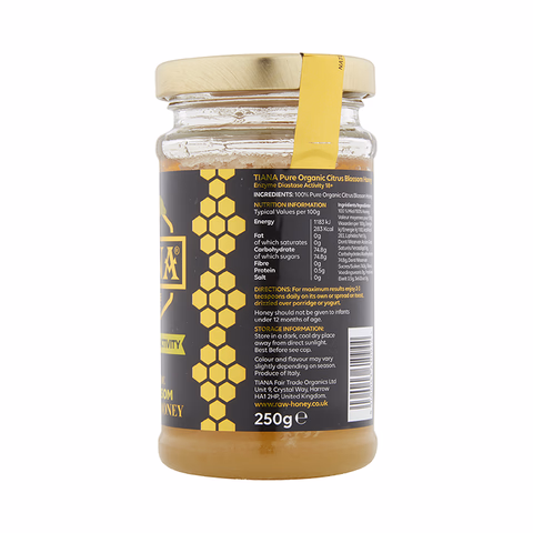 TIANA Pure Organic Citrus Blossom Honey is 100% raw, active, unpasteurised and will crystallise because only raw unpasteurised honey will crystallise. The key difference is that overheated and pasteurised honey will never crystallise. Crystallisation of honey is a natural process which indicates superior quality and nutritional value of raw unheated honey. Ideal for vegetarian, raw, paleo and keto diets. Use as part of a healthy diet and a healthy lifestyle. For maximum benefits use only 2-3 teaspoons daily. Excellent on its own by spoon or spread on toast.